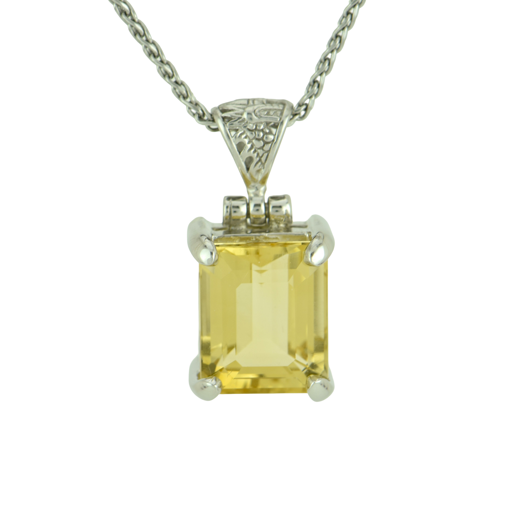 Emerald Cut Citrine Pendant, set in Sterling Silver plated in White Rhodium