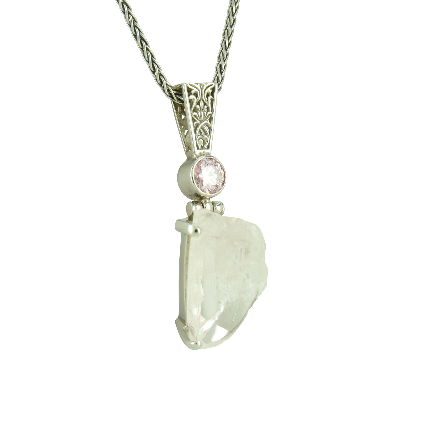 Large natural raw Danburite paired with a faceted Pink Moissanite set in Sterling Silver & plated in White Rhodium
