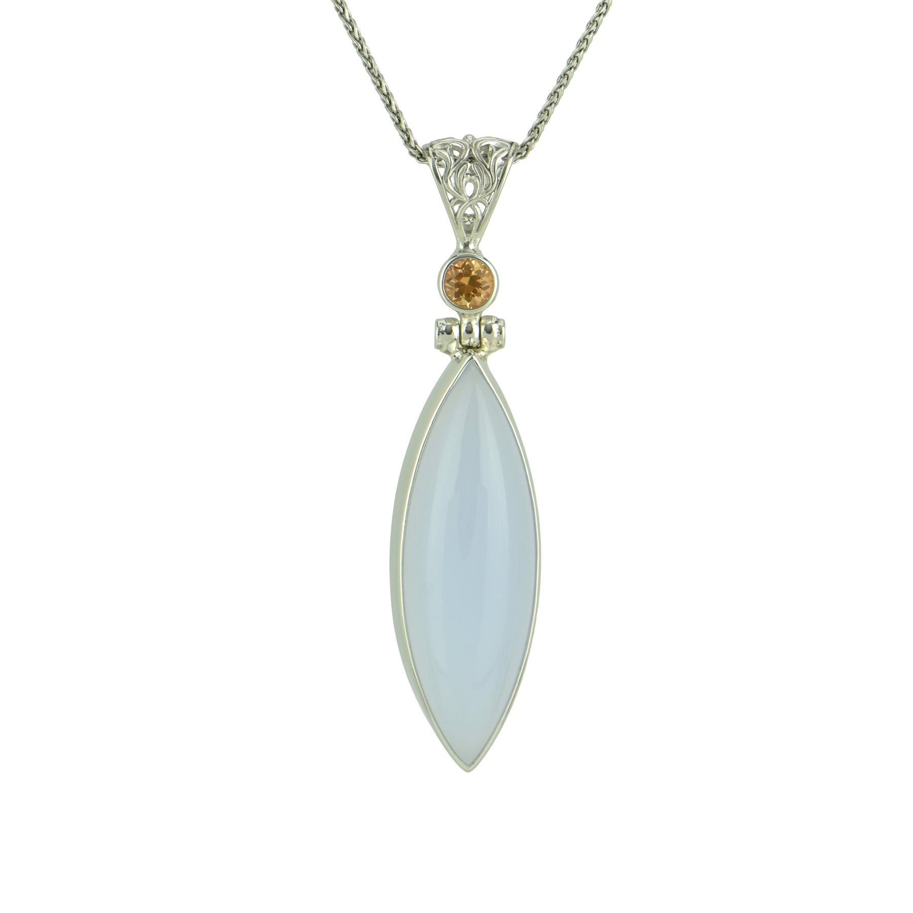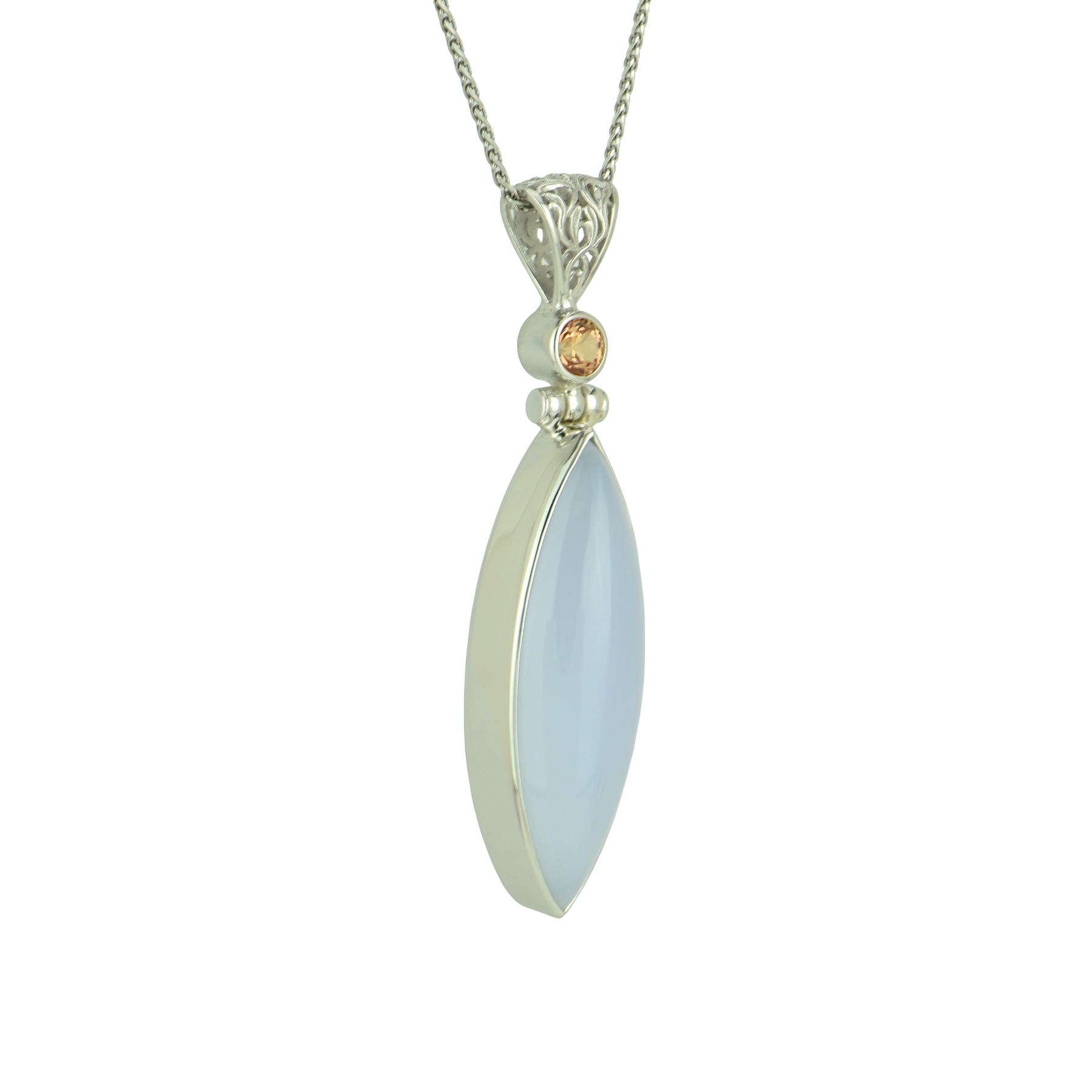 Large marquis shape Chalcedony paired with a Golden Imperial Pink Sapphire set in Sterling Silver plated in White Rhodium