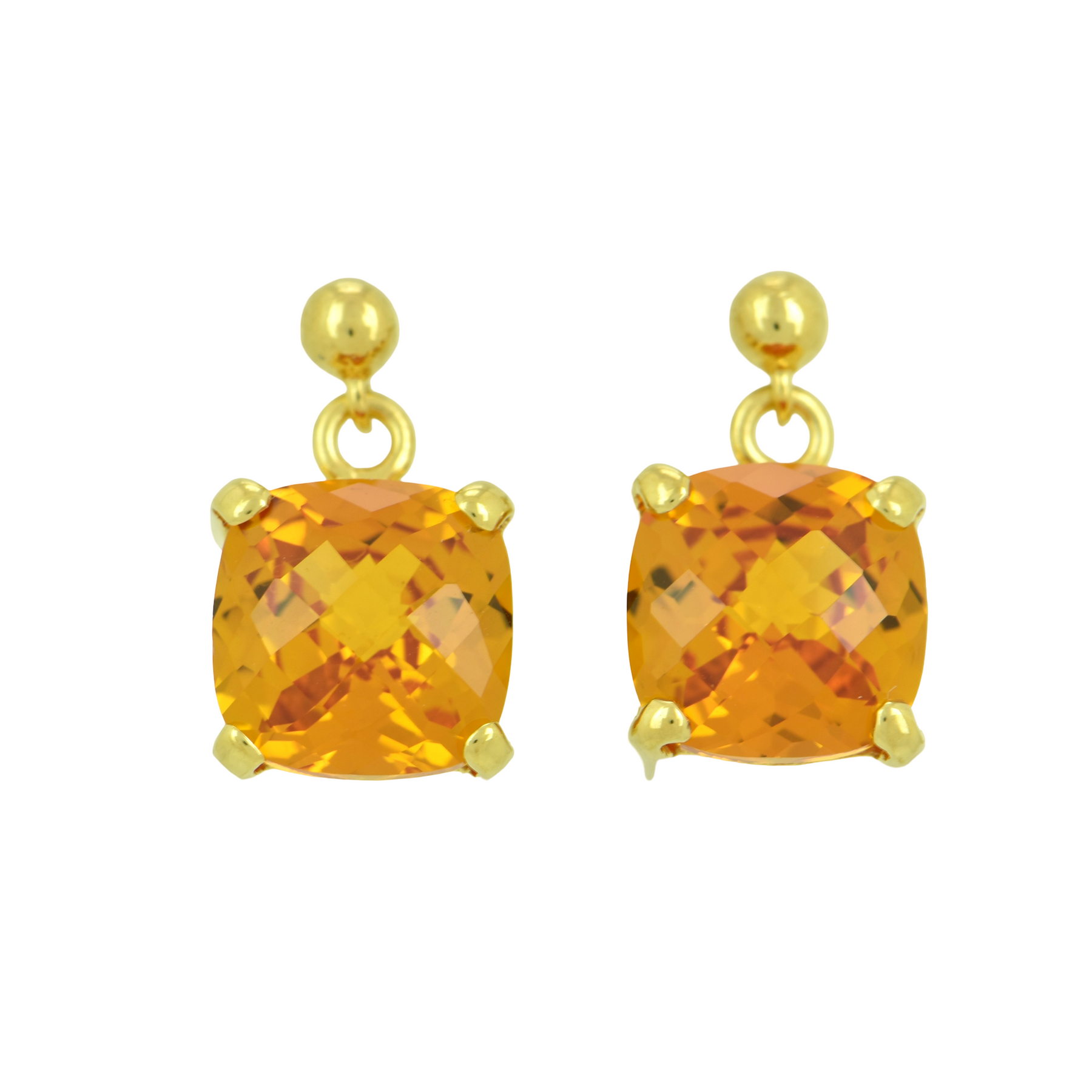 Cognac Sapphire square checkerboard cut dangle stud earrings set in sterling silver & plated in yellow gold