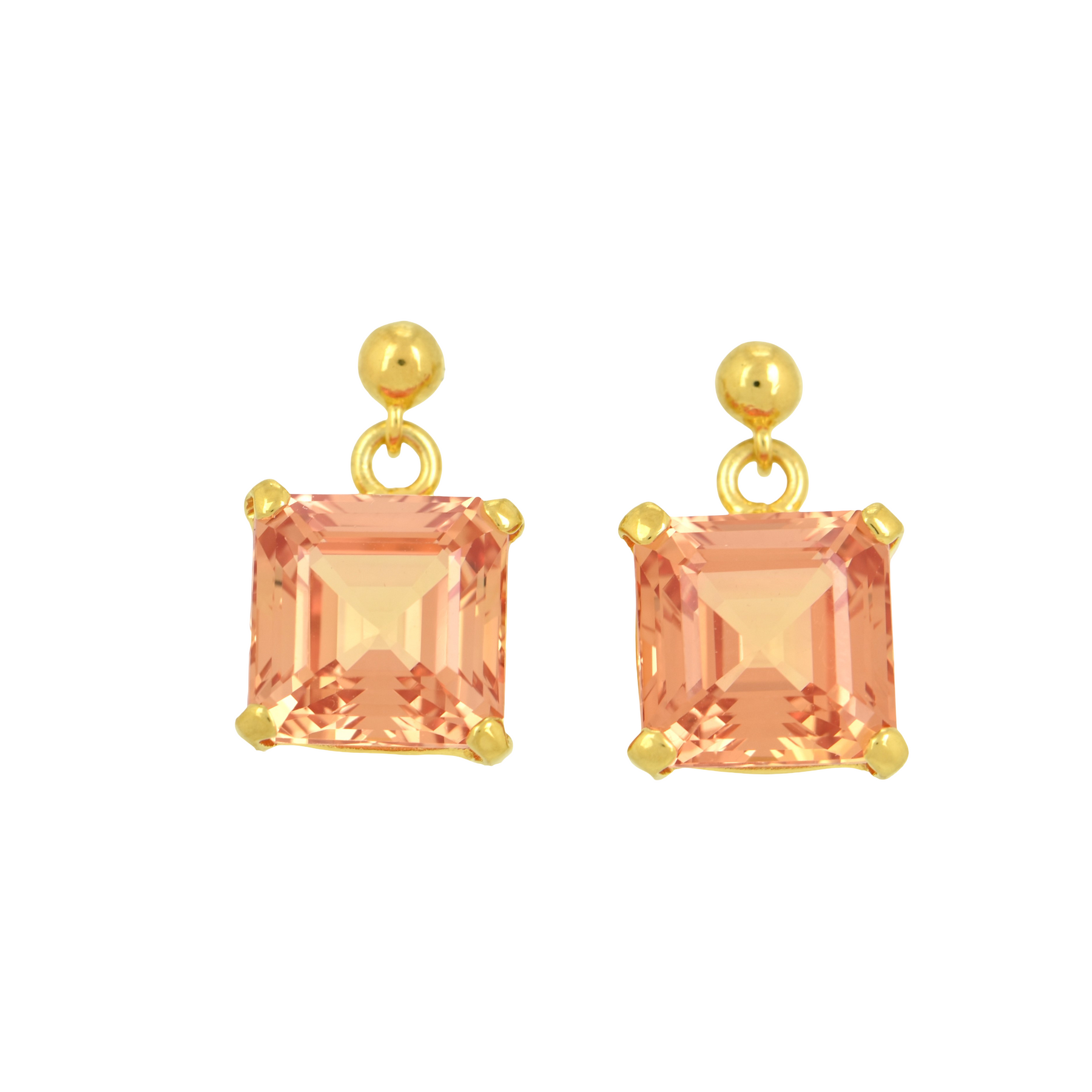 Imperial Pink Sapphire square asscher cut dangle stud earrings set in Sterling Silver plated in yellow gold