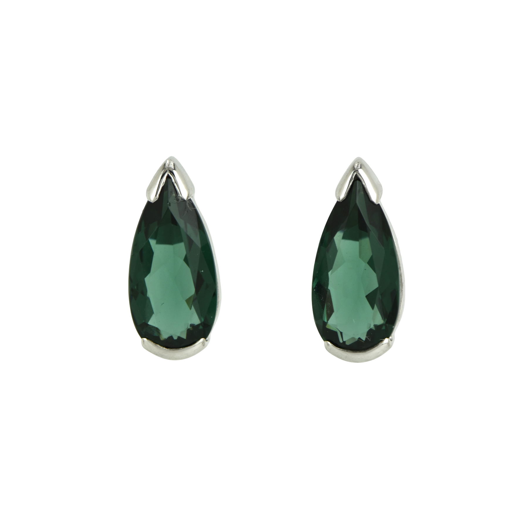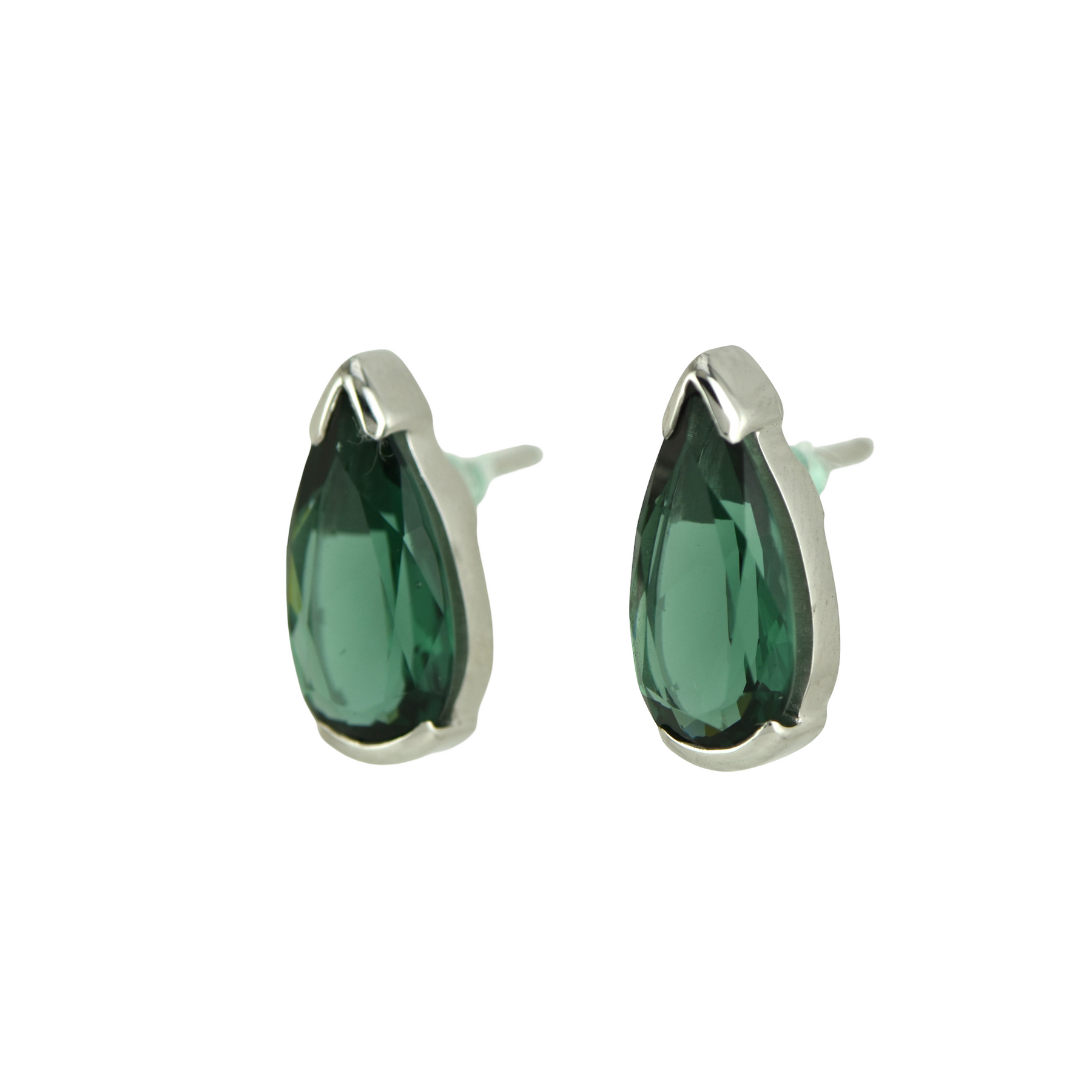 Green Obsidian pear shape stud earrings set in Sterling Silver plated in White Rhodium
