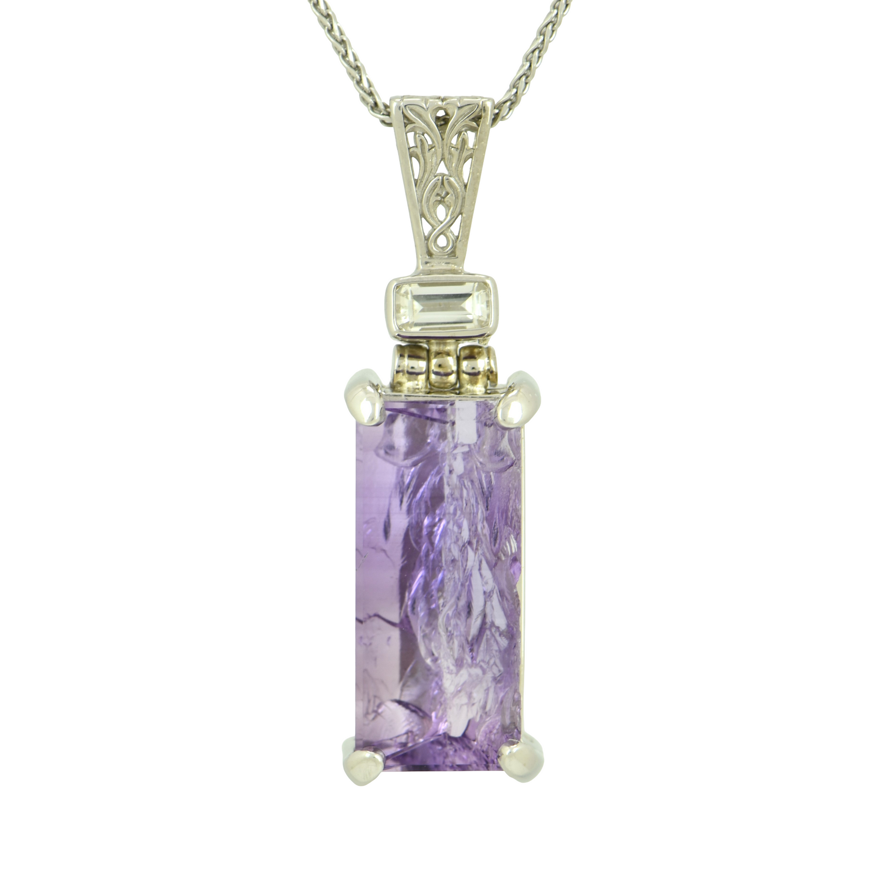 Lavender De Fleur Amethyst Angelic Reflections Pendant, Rectangle Cut, set in Sterling Silver plated in White Rhodium