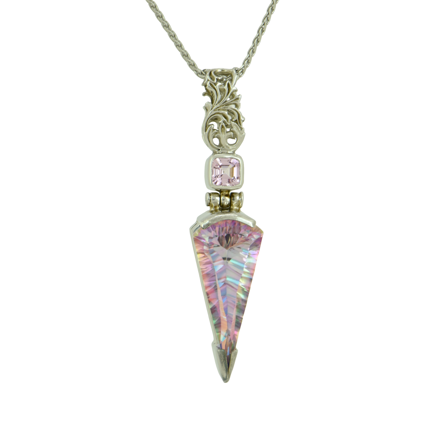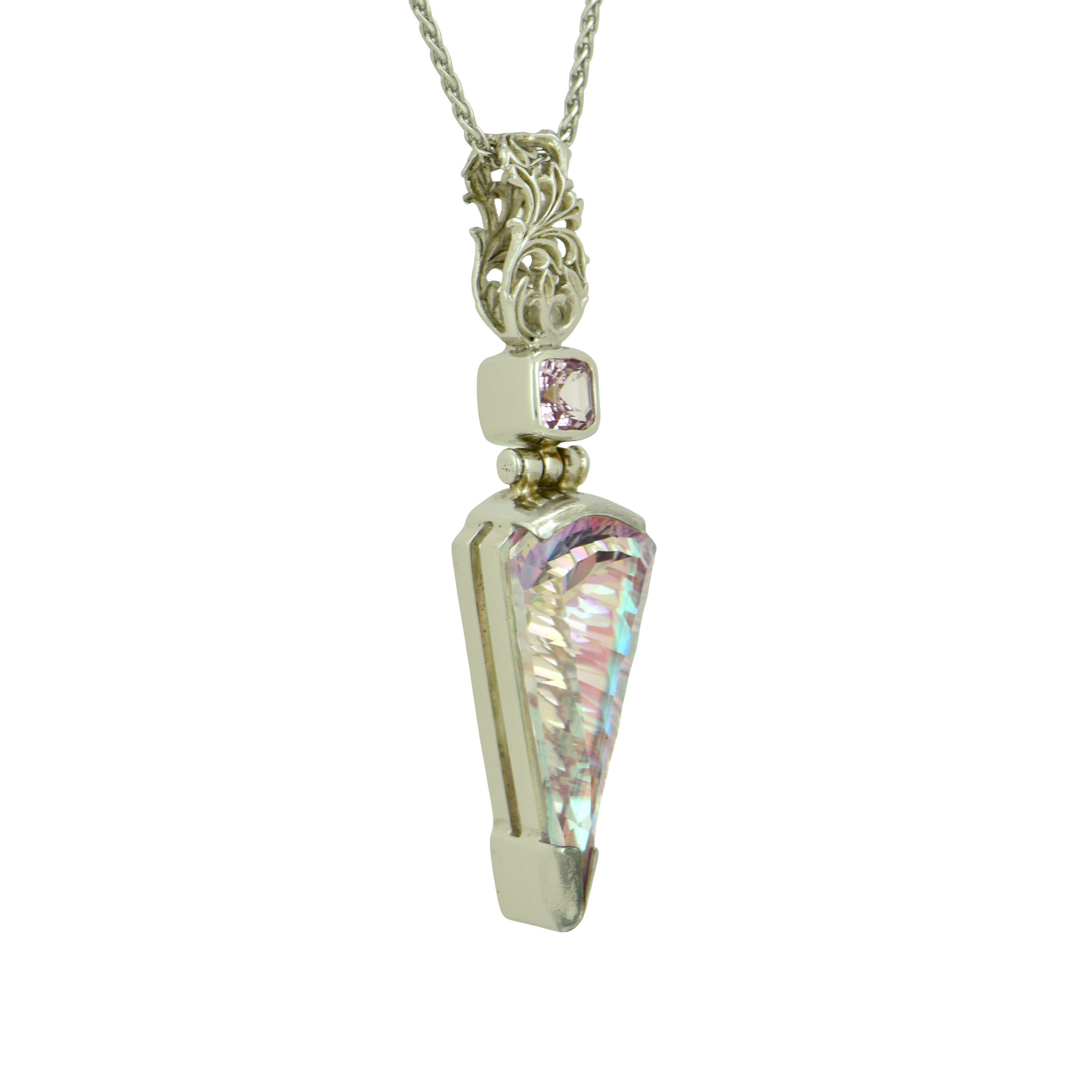 Fan Shape Tara Mystic Quartz Pendant, set in Sterling Silver plated in White Rhodium