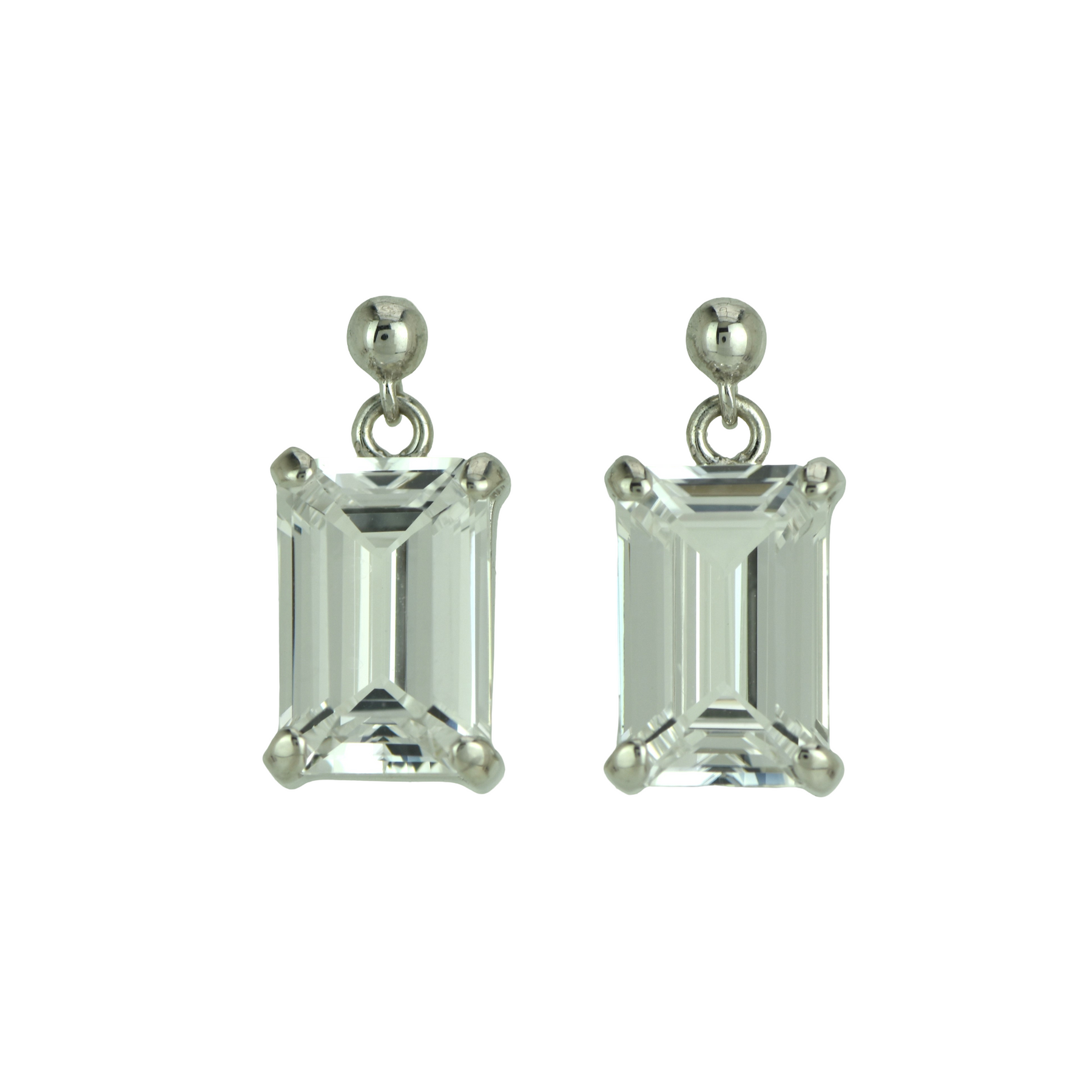 White Sapphire rectangle dangle stud earrings set in Sterling Silver plated in White Rhodium