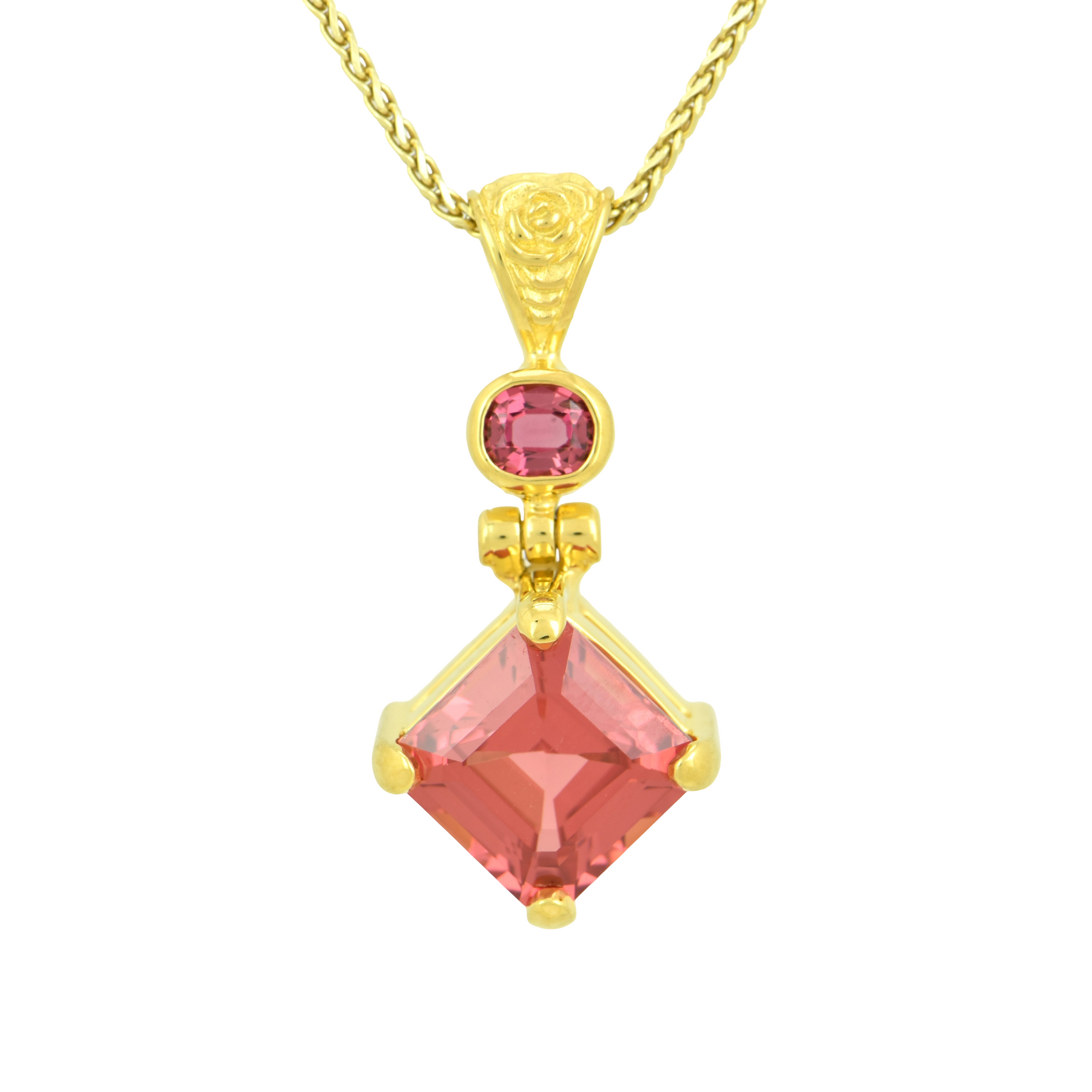 Small diamond shape square Padparadscha Sapphire paired with a natural Red Spinel set in Sterling Silver plated in Yellow Gold