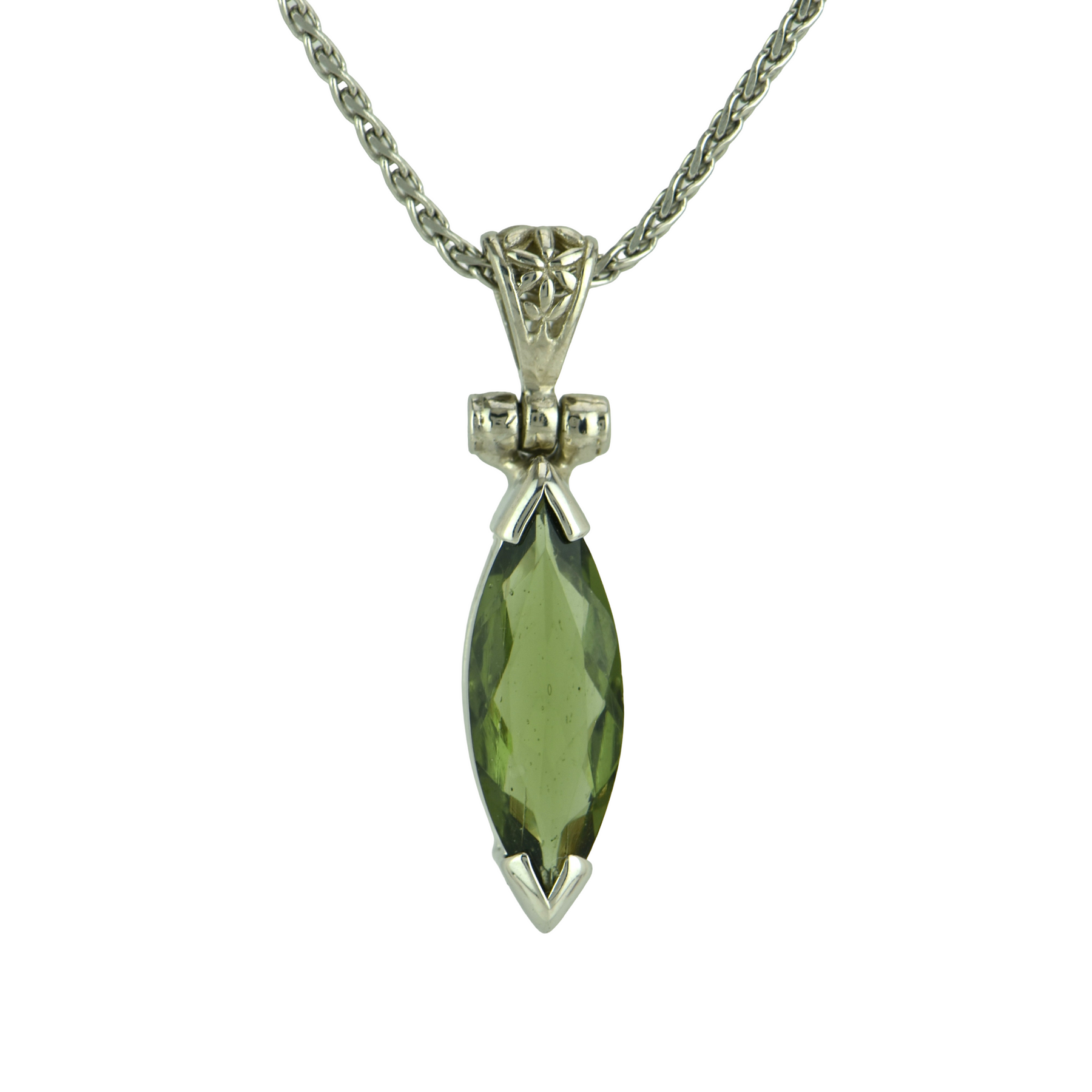Small marquis shape faceted Moldavite set in Sterling Silver & plated in White Rhodium
