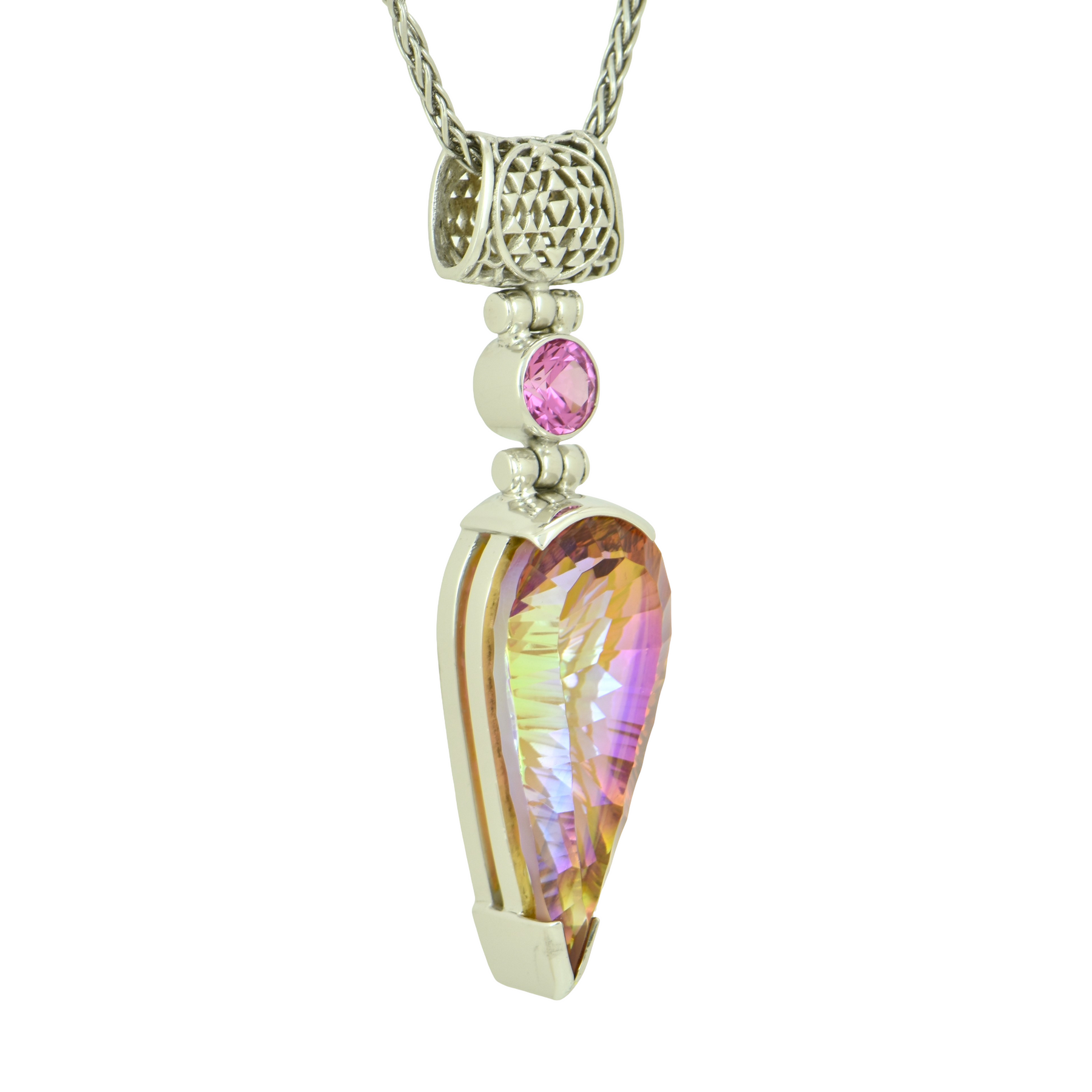 Large Fan shape Sunstar Mystic Quartz paired with a Shasta Pink Sapphire set in Sterling Silver plated in White Rhodium