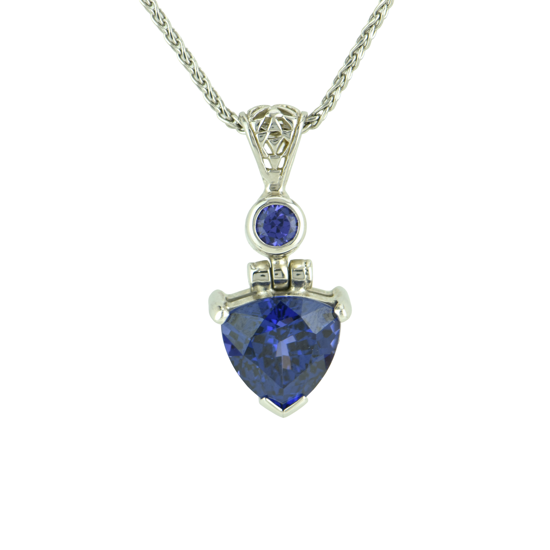 Mini Trillion shape Tanzanite Effect YAG Garnet paired with a natural Tanzanite set in Sterling Silver & plated in White Rhodium