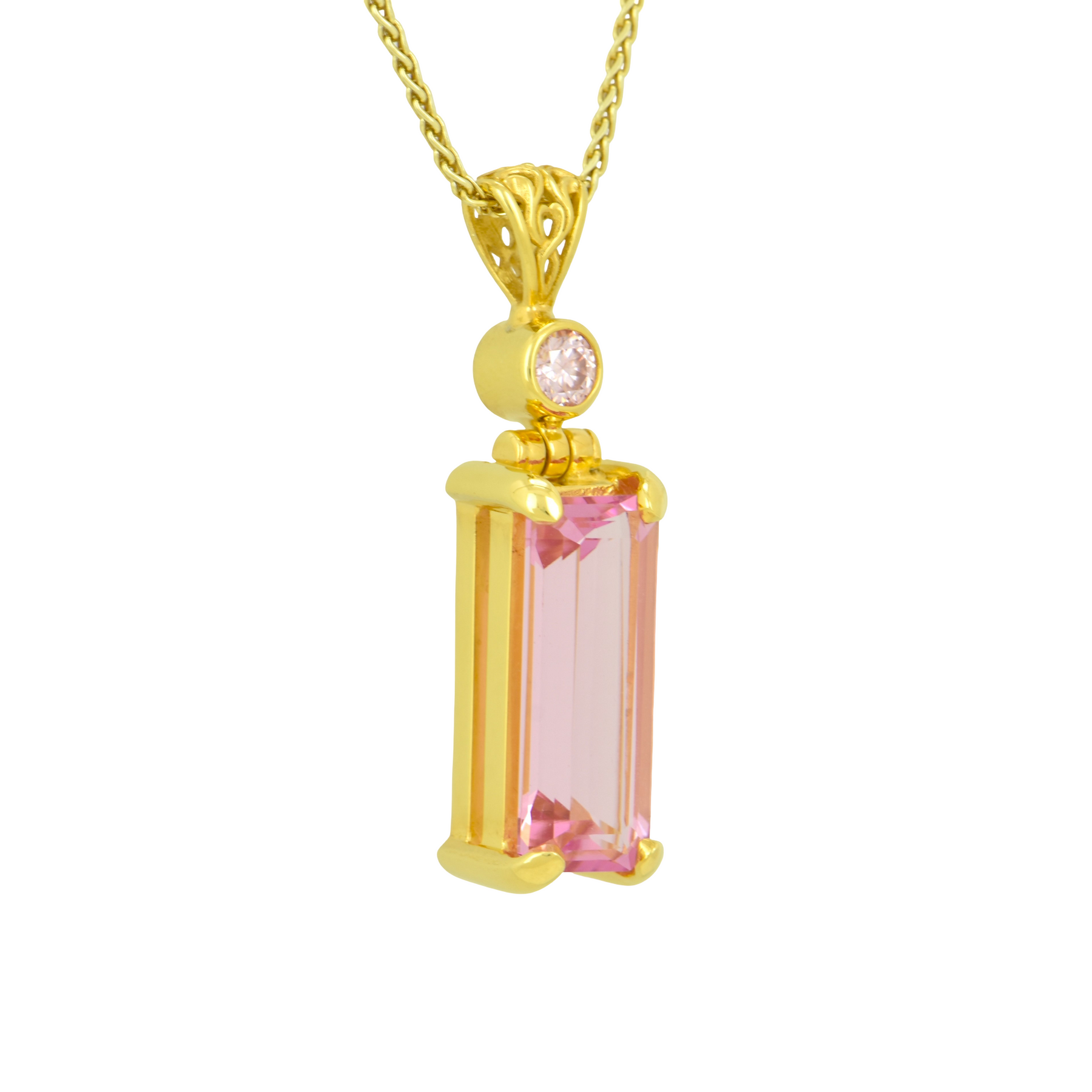 Medium Rectangle shape Pink Biron Emerald paired with a natural Pink Moissanite set in Sterling Silver plated in Yellow Gold