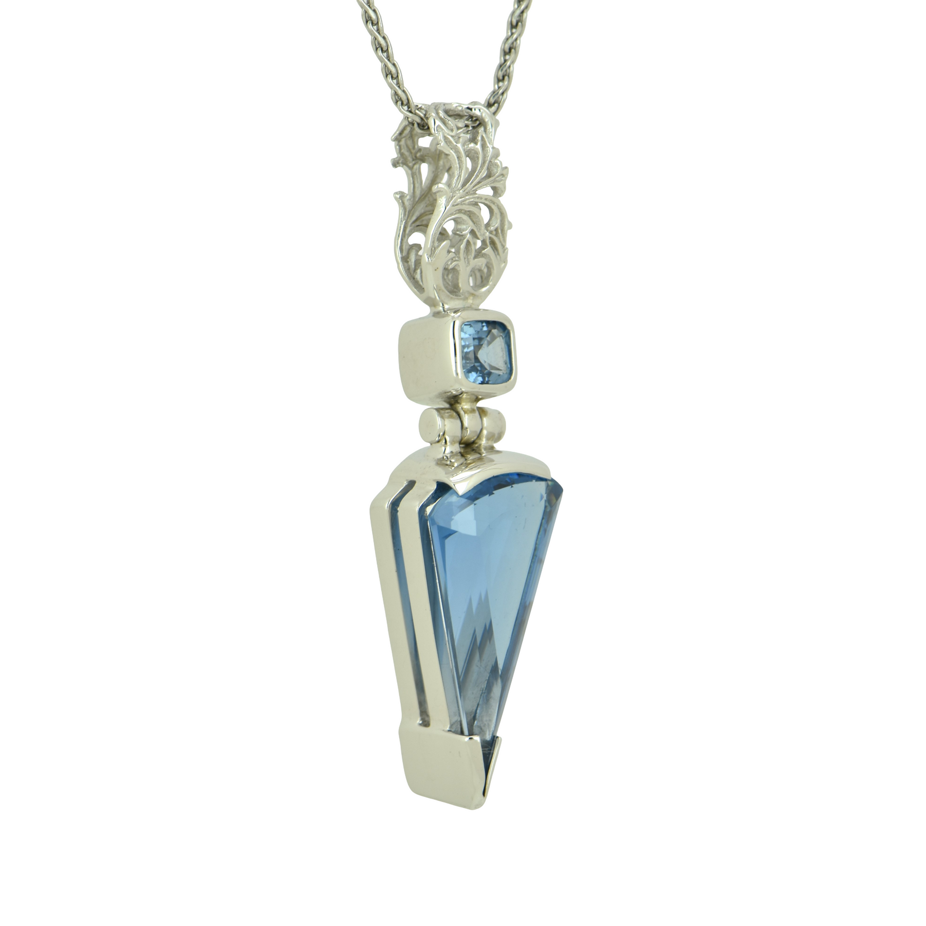 Fan Shape Blue Green Spinel, set in Sterling Silver plated in White Rhodium
