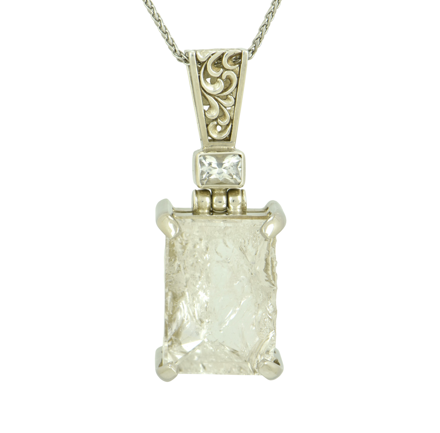 Quartz Angelic Reflections Pendant, Rectangle Cut, set in Sterling Silver plated in White Rhodium