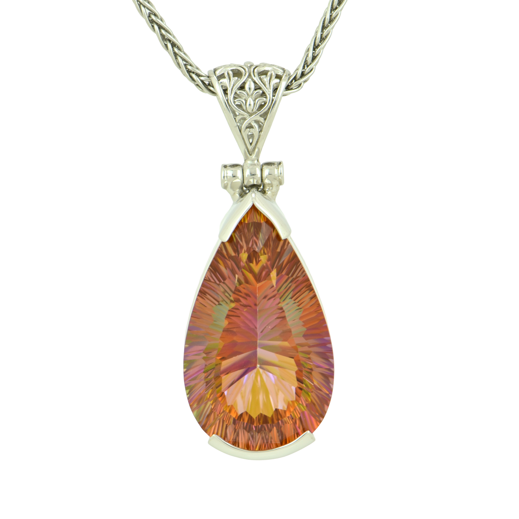 Large pear shape Sunstar Mystic Quartz set in Sterling Silver plated in White Rhodium